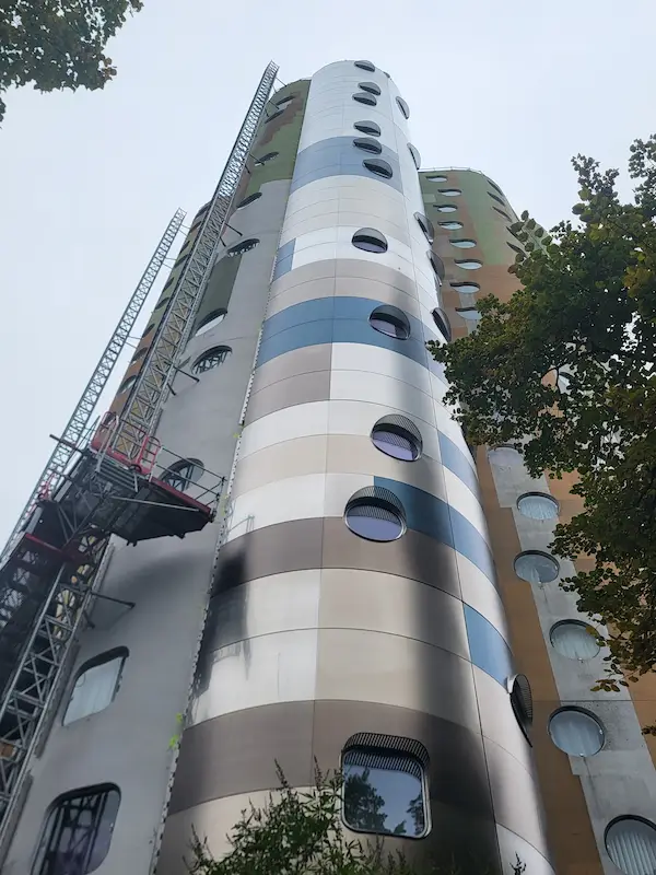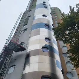 La réhabilitation consiste en la pose d’une isolation thermique par l’extérieur composée de blocs préfabriqués en acier inoxydable intégrant une laine de roche. Chaque bloc, d’environ 2,60 m de hauteur, est fabriqué sur mesure pour épouser la courbure spécifique de chaque tour. La façade de la tour pilote n°15 représente au total près de 5 000 m² de bardage inox.