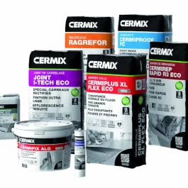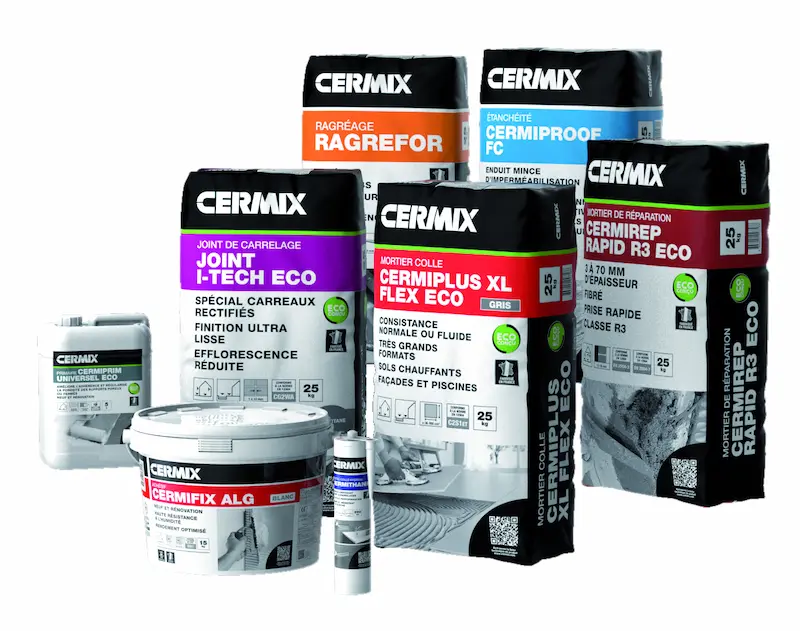 Aujourd’hui, CERMIX est le seul industriel sur son marché à proposer une gamme complète couvrant tous les besoins sur chantier. L’artisan ou l’entreprise peut ainsi intervenir sur toute typologie de travaux, de la préparation à la réparation avec des produits éco-conçus : pose de carrelage petits ou grands formats, pose sur sols chauffants, intervention sur façades, réparation et ragréage des bétons, etc. Grâce à la gamme éco‑conçue Cermix, il réduit l’impact carbone sans changer ses habitudes, avec des produits au même prix et sans compromis sur la qualité et les performances.
