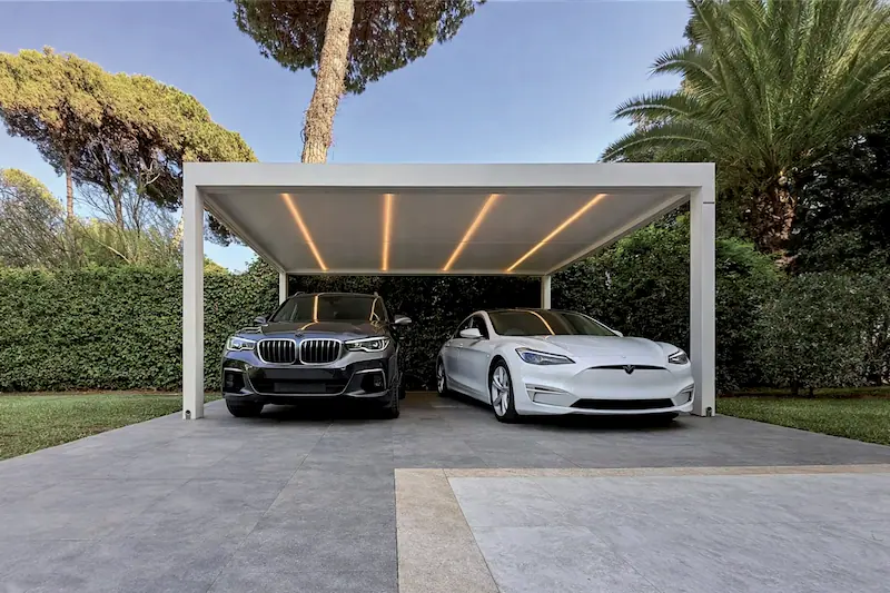 Enfin, elle peut également être utilisée comme carport, protégeant efficacement les véhicules contre les intempéries, les rayons UV, les feuilles mortes et les dépôts extérieurs, tout en conservant une esthétique soignée.