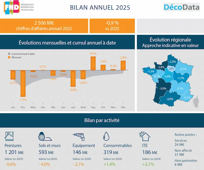 En 2025, le marché de la décoration professionnelle affiche un repli limité de -0,9 % en valeur, pour un chiffre d’affaires global de 2 506 M€, selon les données du DécoData* analysées par la Fédération Nationale de la Décoration (FND).