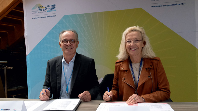 Le projet d’équipement de l’Eco-Campus, intégrant la conception puis la mise en œuvre de plusieurs plateformes dédiées aux traitements des énergies, de l’air, ainsi qu’à la gestion de l’eau au bénéfice des formations, fait écho à la démarche sociétale qui impacte en premier lieu les bonnes pratiques de ces secteurs d’activités. En effet, dans un environnement aux perspectives de plus en plus réglementées, particulièrement dans le cadre de la RE 2020, les équipements conçus par les fabricants supposent pour la mise en œuvre, des connaissances techniques spécifiques, des produits et une rigueur procédurale de plus en plus cadrée. La démarche initiée au sein de l’Eco‑Campus trouve ici tout son sens en associant tous les acteurs de la chaîne de mise en œuvre, en assurant du lien entre des jeunes, potentiels apprentis, des entreprises formatrices, des actions de formations continues et des industriels tel que GEBERIT.
