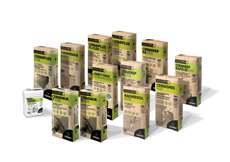 Facilement identifiable grâce à une charte graphique dédiée, cette offre a été développée par la R&D de CERMIX dans un esprit d’innovation durable. Chaque produit est décliné avec son nom d’origine pour une meilleure lisibilité et compréhension de l’utilisateur (par exemple CERMIGRÈS devient CERMIGRÈS ÉCO).